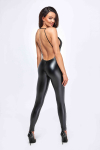 Provocante et résolument féminine, adoptez cette combinaison moulante en wetlook fendue à l'entre-jambe, ornée d'un bijou strass qui descend derrière le long du décolleté dos nu.